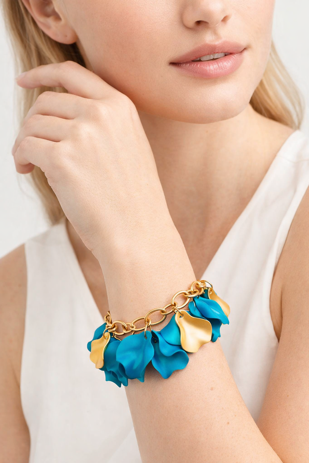 18K gold-plated link bracelet embellished with metallic resin petals and two 18K gold-plated matte petal accents.