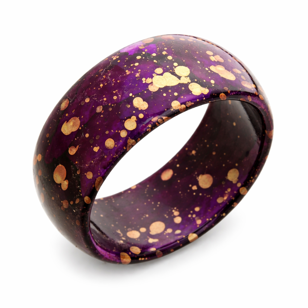 - This bold, glossy bangle features a rich deep-purple resin base accented with artistic gold splatter detailing for a luxe, statement-making finish.