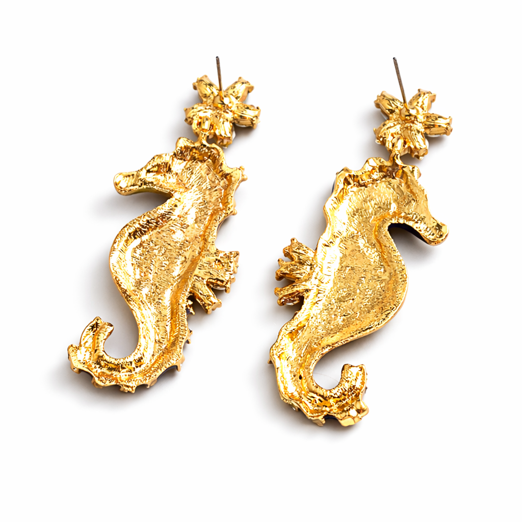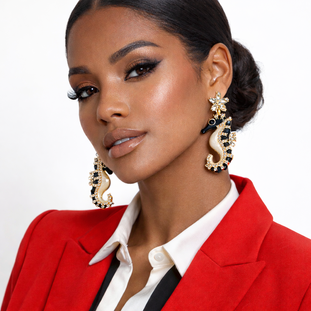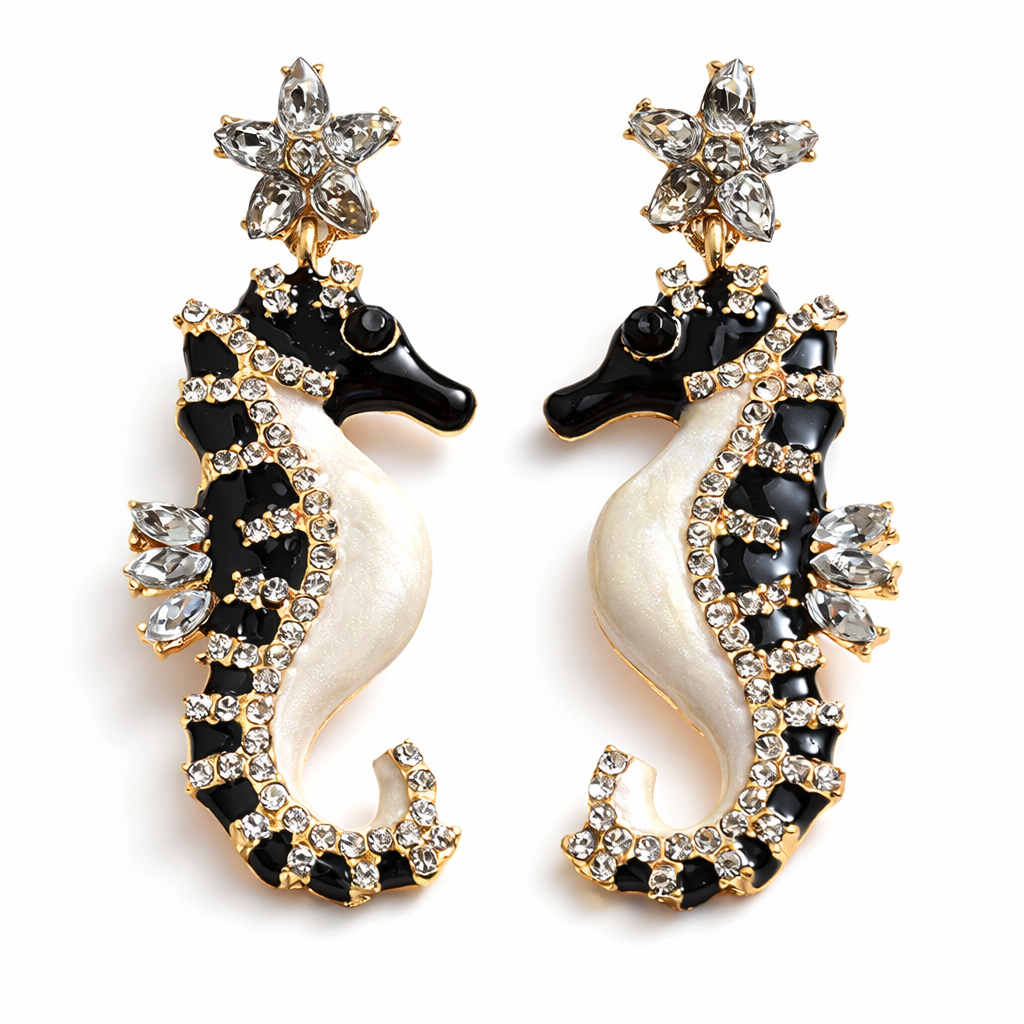 - These seahorse statement earrings are a bold blend of elegance and artistry. Designed in a gold-tone finish, each earring features a beautifully sculpted seahorse silhouette accented with glossy black enamel and soft pearlescent white detailing. Sparkling clear rhinestones trace the curves of the body and tail, adding brilliance and dimension from every angle.