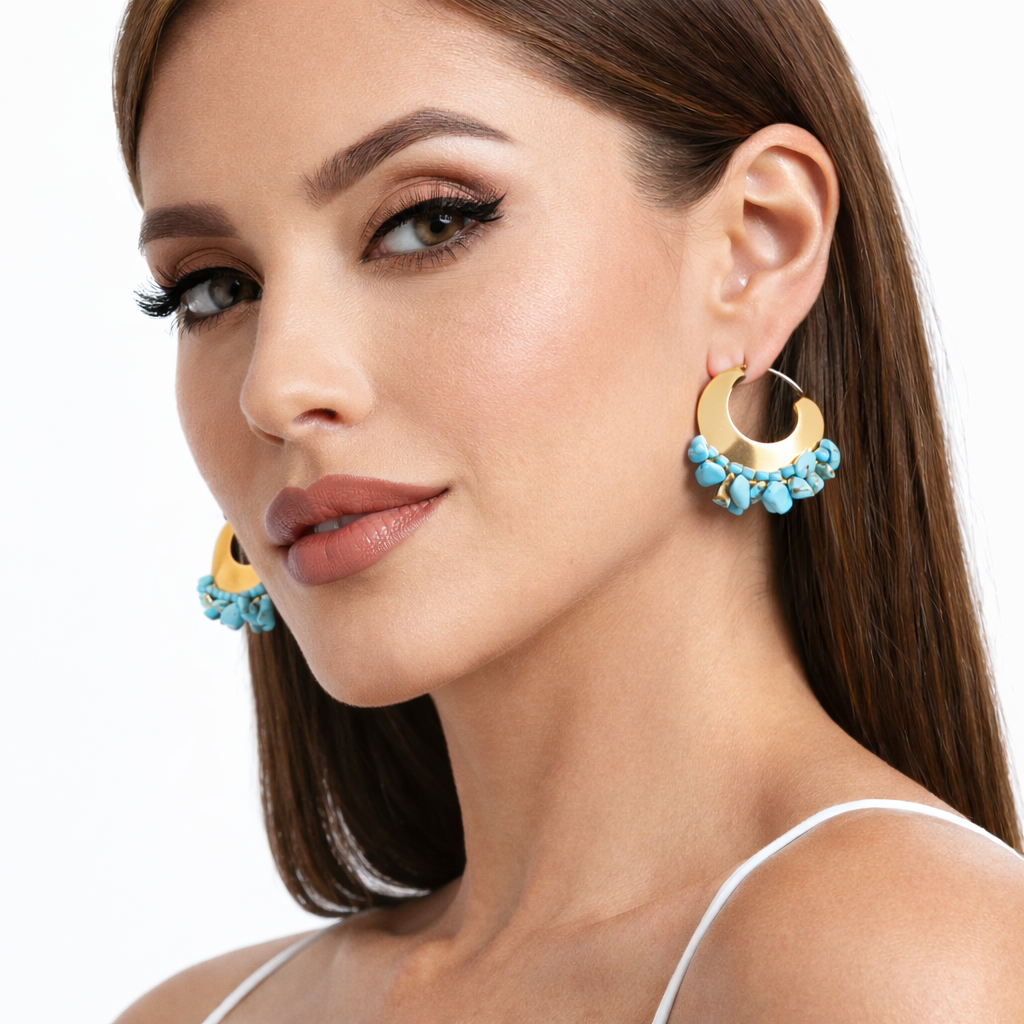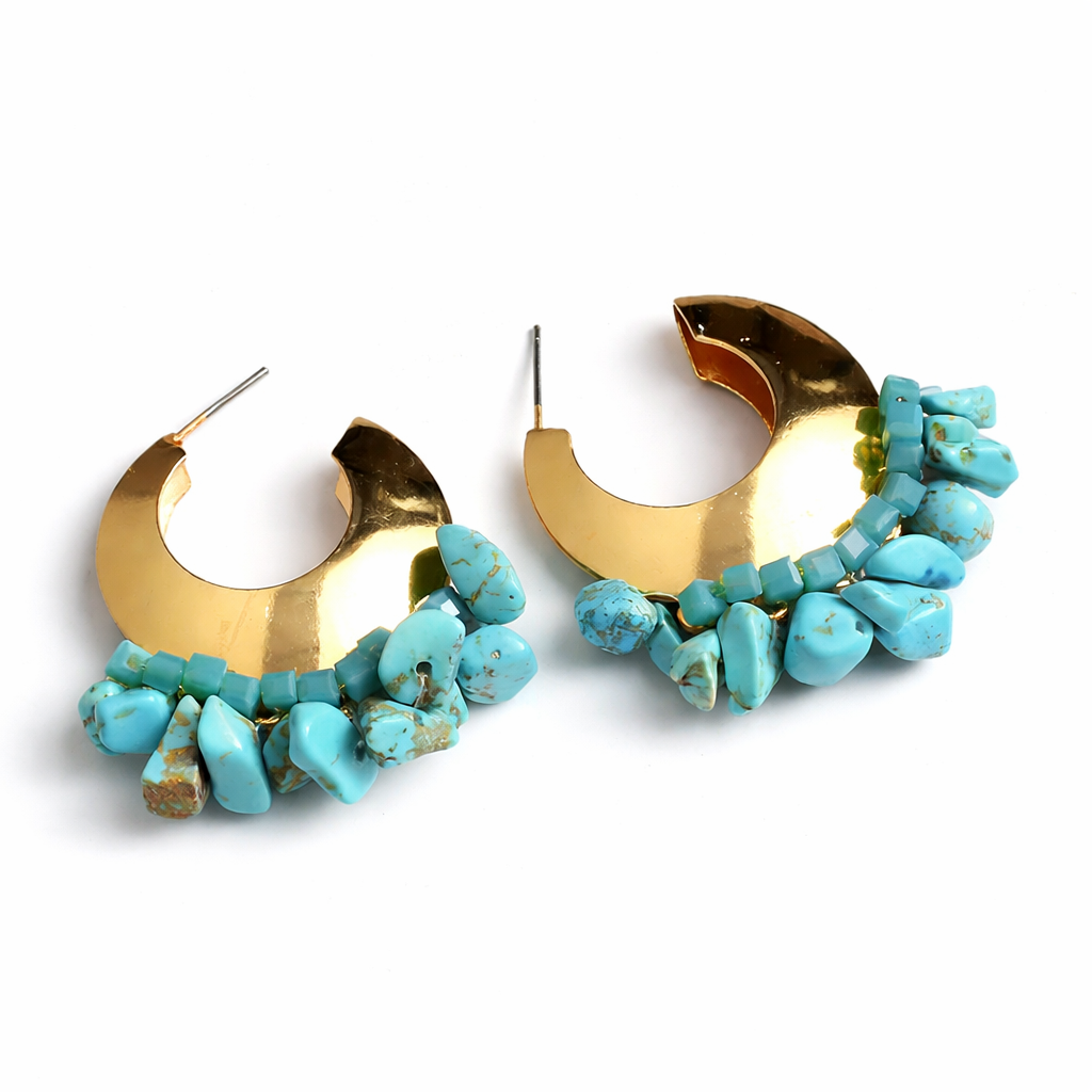 - These bold statement earrings feature a polished gold crescent hoop accented with a striking cluster of vibrant turquoise stones.