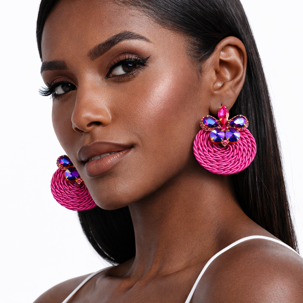 - These bold statement earrings feature a vibrant hot pink woven disc base, intricately coiled for rich texture and dimension.