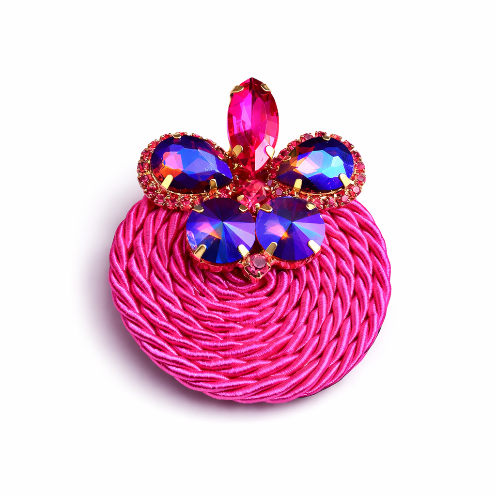 - At the top, a sparkling floral cluster of fuchsia and iridescent blue crystals adds dramatic shine and eye-catching contrast.