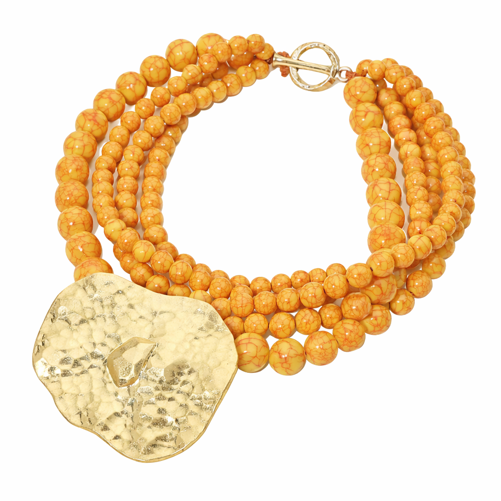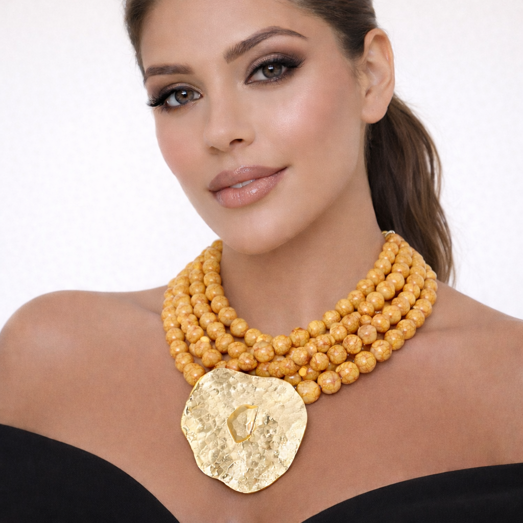 - Eye-catching statement necklace designed with layered beaded strands and a bold textured pendant that creates depth and movement.