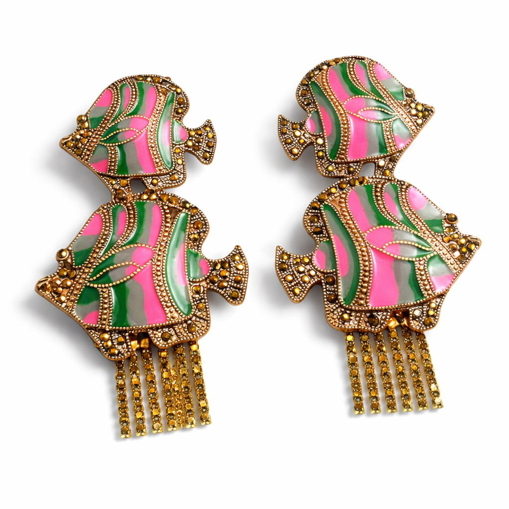 - Crafted in a rich gold-tone setting, each earring showcases a double fish silhouette adorned with vibrant enamel in swirling shades of pink, emerald green, and soft mint. The flowing, wave-like pattern gives the design movement and an artistic, almost hand-painted feel.